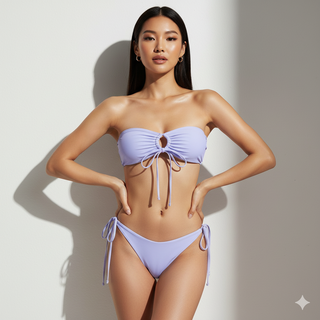 Dive into summer with our chic lavender ribbed bikini set. The unique tie-front bandeau top and flattering high-cut bottoms combine comfort with effortless style, making this a must-have for your next vacation
